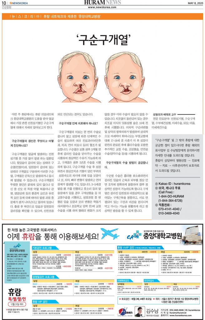 이번 주 휴람에서는 휴람 의료네트워크 중앙대학교병원의 도움을 받아 얼굴에서 가장 흔한 선천성기형인 구순구개열에 대해서 자세히 알아보고자 한다.