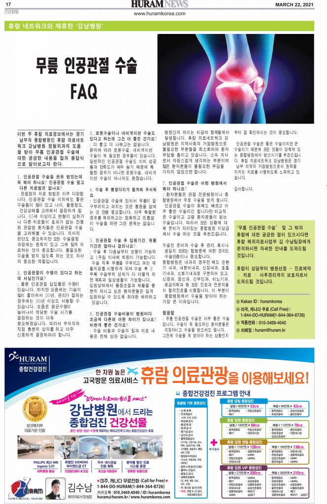 이번 주 휴람 의료정보에서는 경기 남부의 종합병원인 휴람 의료네트워크 강남병원 정형외과의