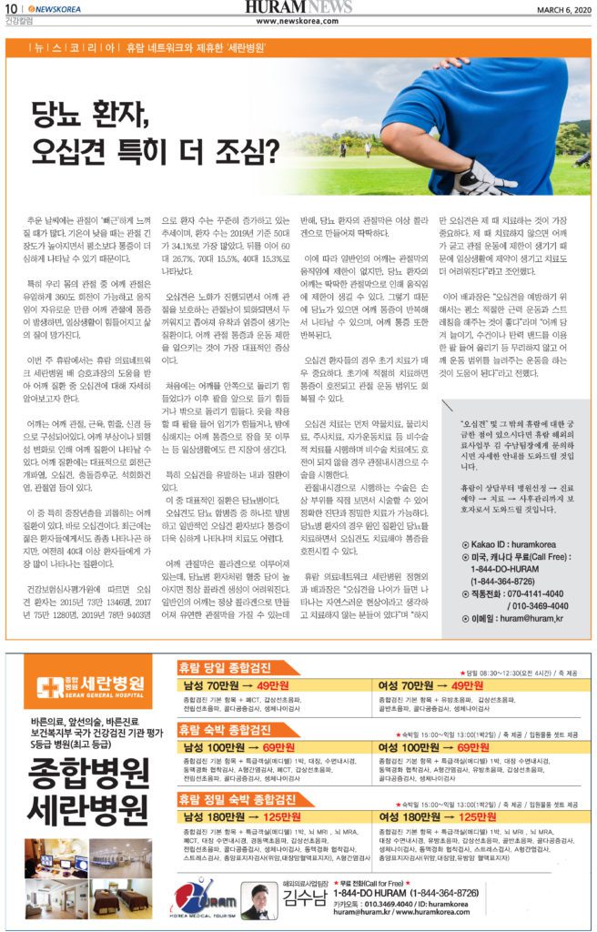 이번 주 휴람에서는 휴람 의료네트워크 세란병원 배 승호과장의 도움을 받아 어깨 질환 중 오십견에 대해 자세히 알아보고자 한다.
