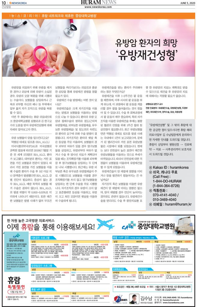 이번 주 휴람에서는 휴람 의료네트워크 중앙대학교병원 성형외과 김 한구교수의 도움을 받아 유방재건성형에 대해 자세히 알아보고자 한다.