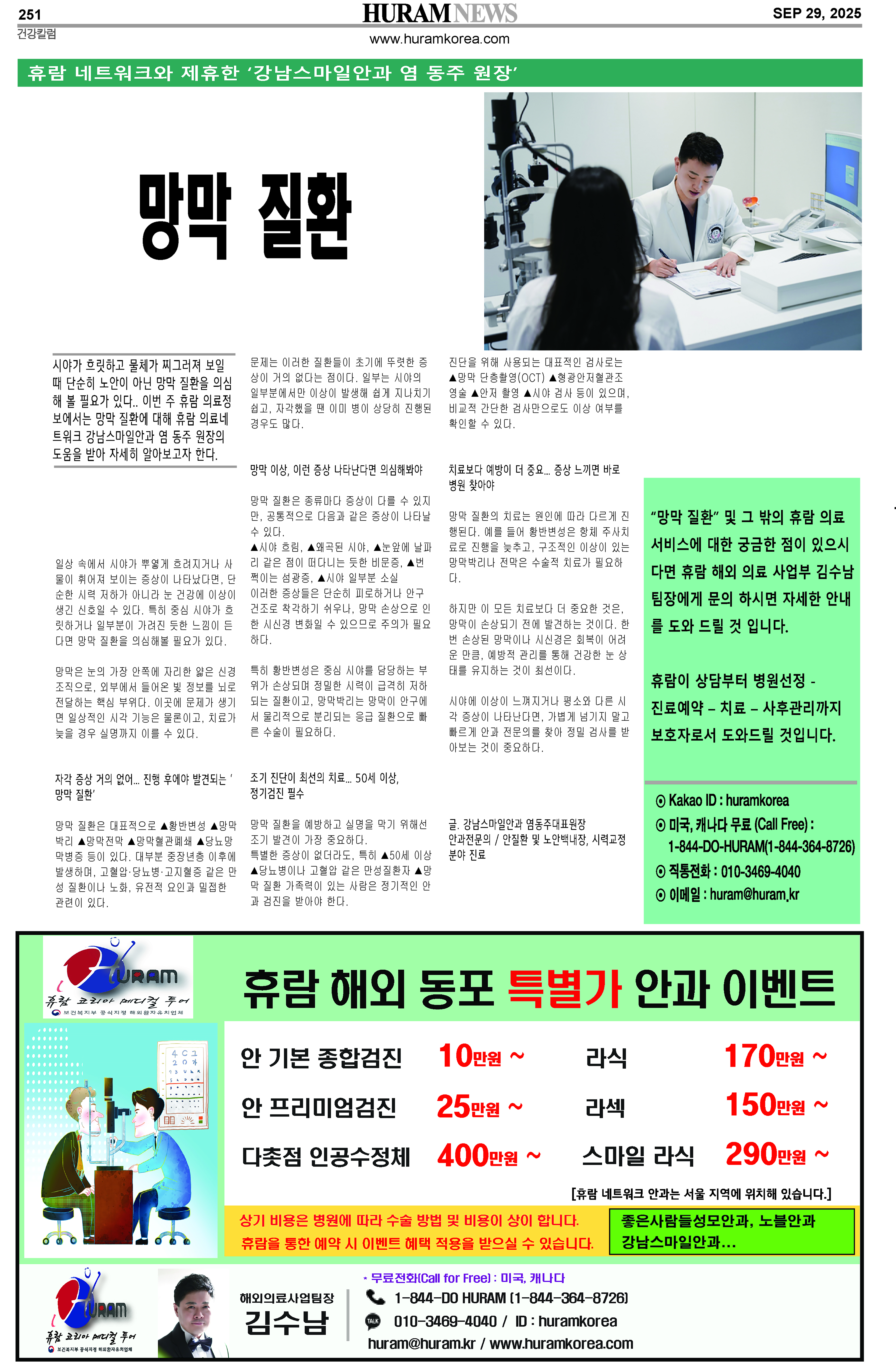 이번 주 휴람 의료정보에서는 망막 질환에 대해 휴람 의료네트워크 강남스마일안과 염 동주 원장의 도움을 받아 자세히 알아보고자 한다.