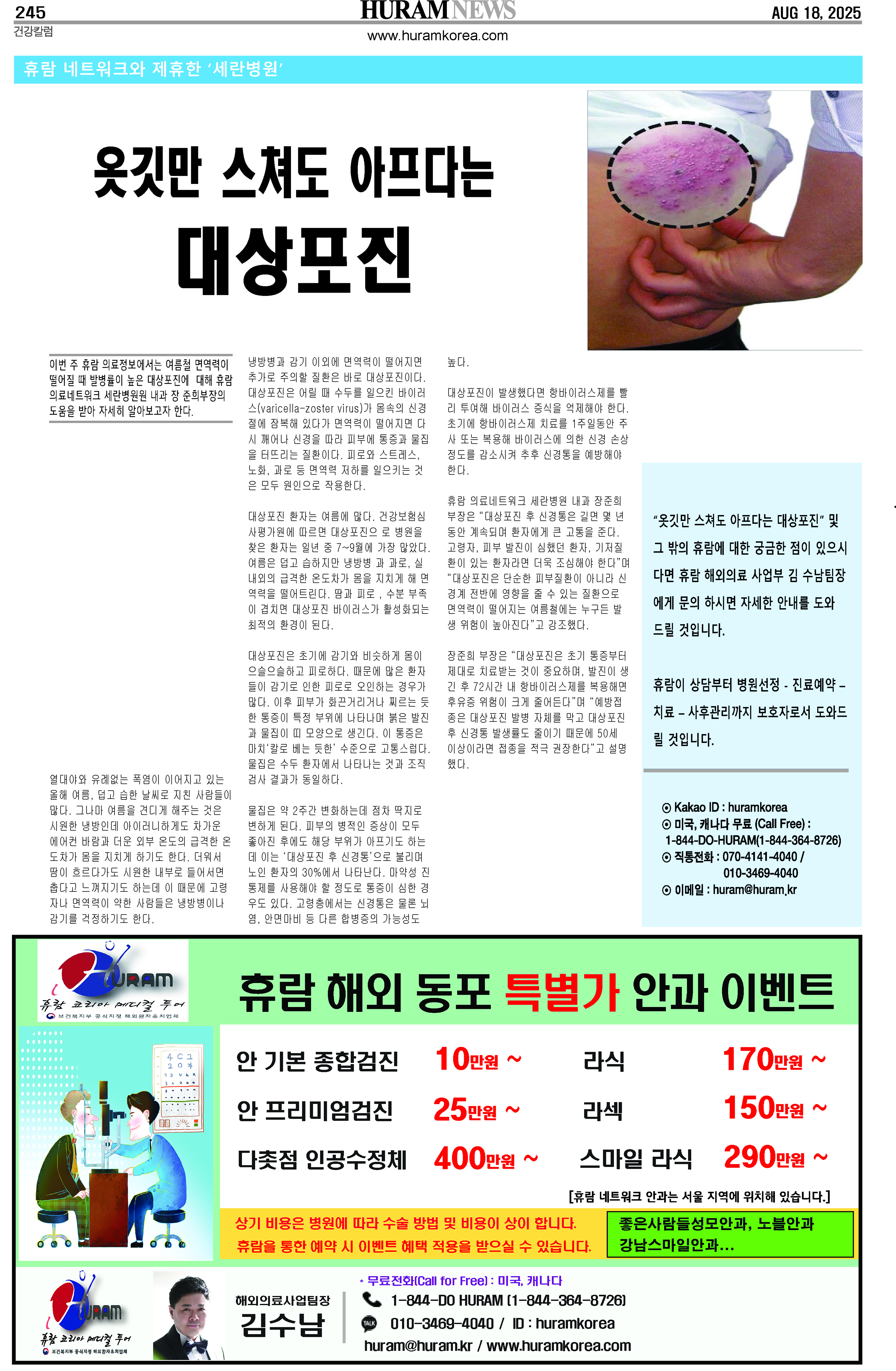 “옷깃만 스쳐도 아프다는 대상포진” 및 그 밖의 휴람에 대한 궁금한 점이 있으시다면 휴람 해외의료사업부 김 수남팀장에게 문의하시면 자세한 안내를 도와드릴 것입니다.