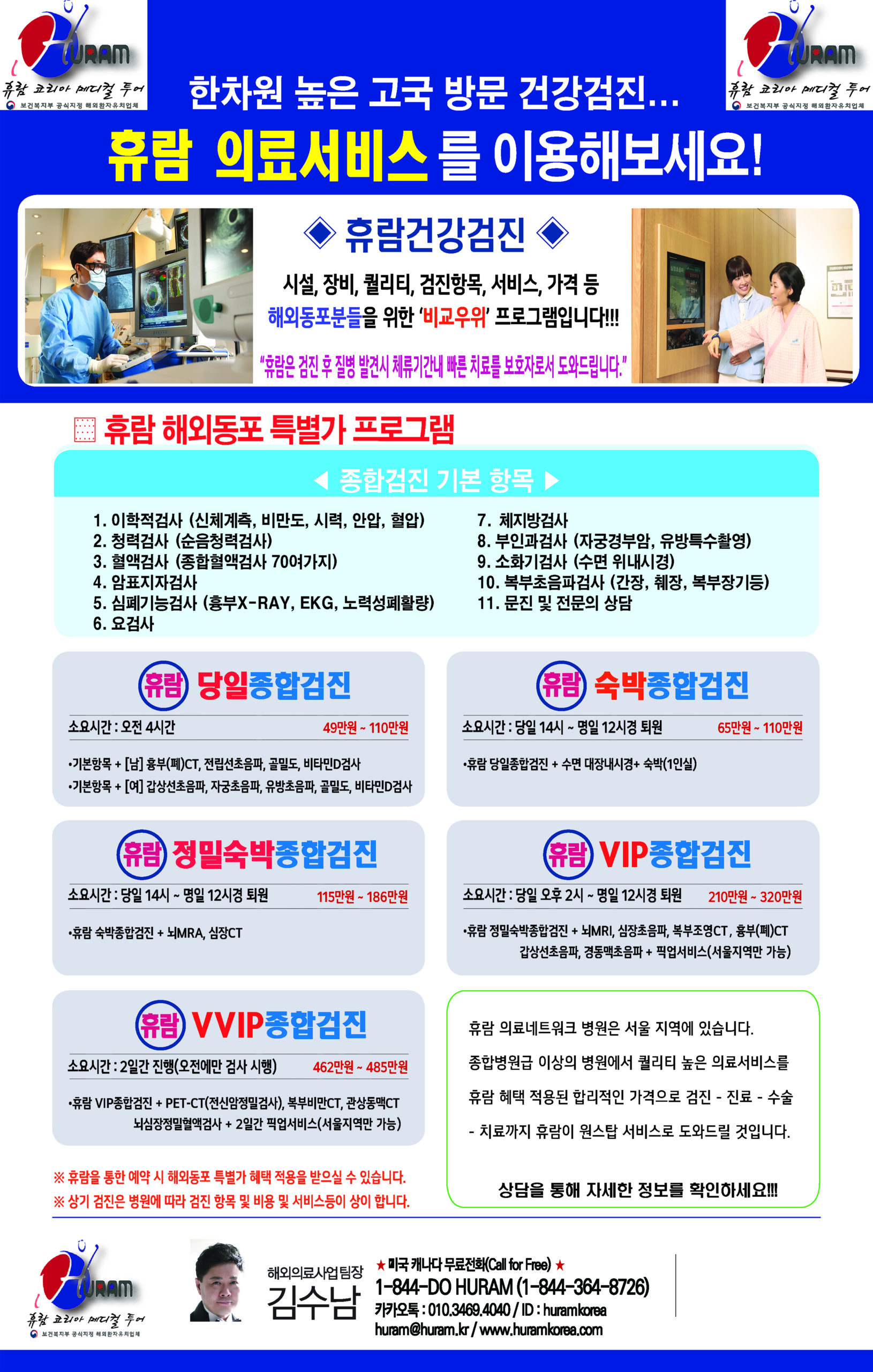 휴람 건강검진 네트워크는 상기의 조건에 부합하는 검증된 병원과 제휴하여 해외동포분들께 검진항목 대비 가격이 좋은 특별가 검진을 편안하게 최상의 서비스를 받으실 수 있도록 제공해드리고 있습니다.
